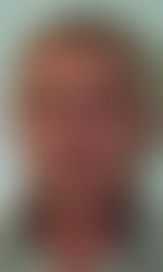 Patient mit erschlaffter Wangenregion („Hamsterbacken“), „verstrichenem“ Unterkiefer-Halswinkel und extremen Hautüberschuss am Hals (auch die darunterliegende, hauchdünne Muskelschicht ist erschlafft). Dies spiegelt sich in einem Verlust der Dynamik des Gesichtes und Halses wider. Starkes „Doppelkinn“. Zudem zeigt sich ein müder Augenausdruck auf Grund der herabgesunkene Augenbrauenpartie und des Pseudohautüberschusses am Oberlid.